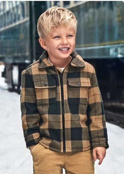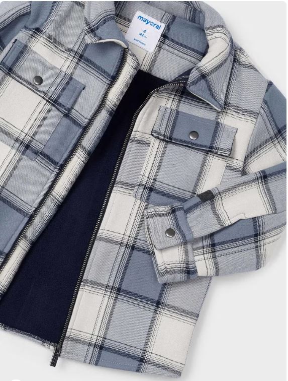 Cazadora de manga larga para niño con puños abotonados. Cuello camisero. Cierre central delantero con cremallera. Bolsillos funcionales en la parte delantera. Motivo de cuadros