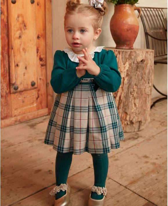 Vestido de manga larga para bebé con puños elásticos. Cuello redondo con volante. Cierre con cremallera trasera invisible. Confección combinada con cuerpo y falda en distintos tejidos para conseguir un diseño único y especial. Elementos de adorno: lazo. Motivo de cuadros.