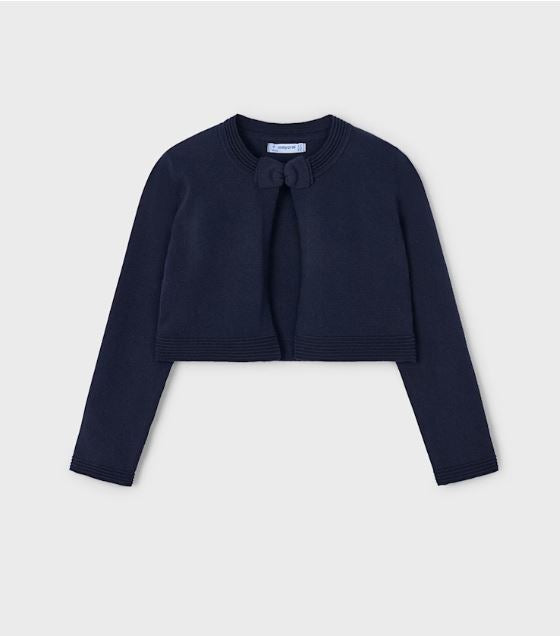 Hermoso chaleco manga larga, a la altura de la cintura, con cierre de broche decorado con un roson en el mismo tejido.