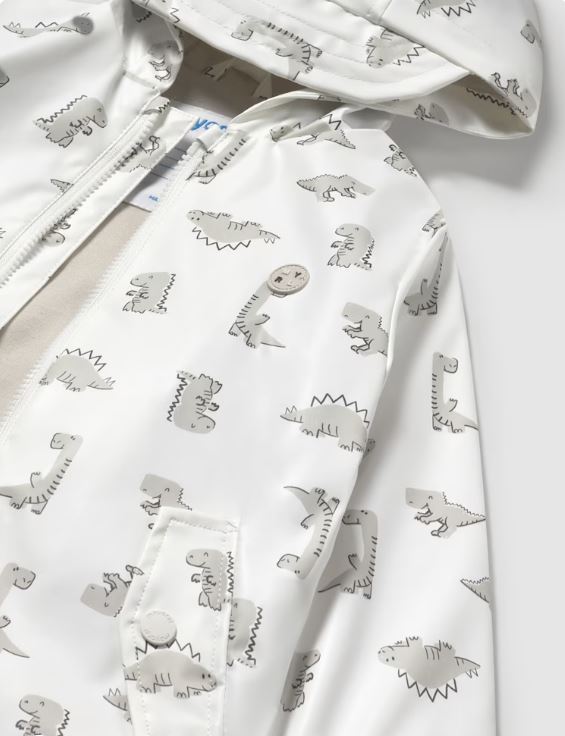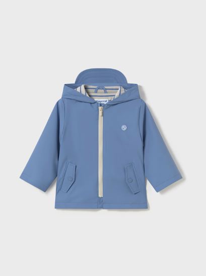 Chubasquero de manga larga para bebé. Cuello con capucha y visera. Cierre central delantero con cremallera. Moderno exterior de polipiel. Forro interior de color a contraste. Bolsillos funcionales en la parte delantera.