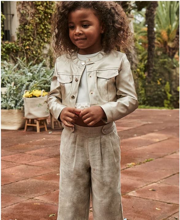 Pantalón largo de tipo culotte para niña, de línea amplia y holgada desde las caderas hasta el bajo. Ideal tanto para los looks más sofisticados como para los más informales. Goma elástica regulable con botones en el interior de la cinturilla para mayor ajuste. Tejido de aspecto fresco y actual con lino. Modelo con pinzas. Bolsillos funcionales en la parte delantera. Elementos de adorno: botones decorativos. Diseño liso.