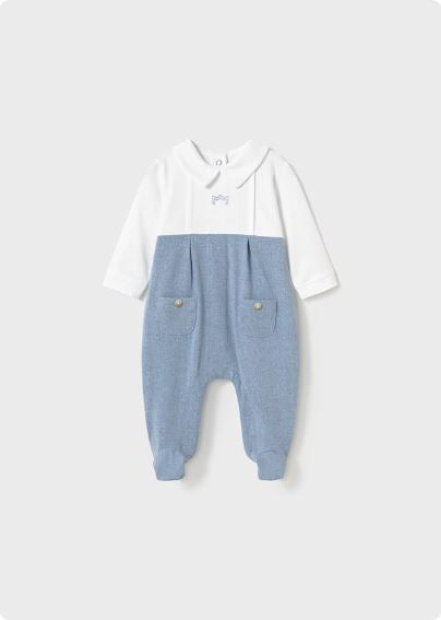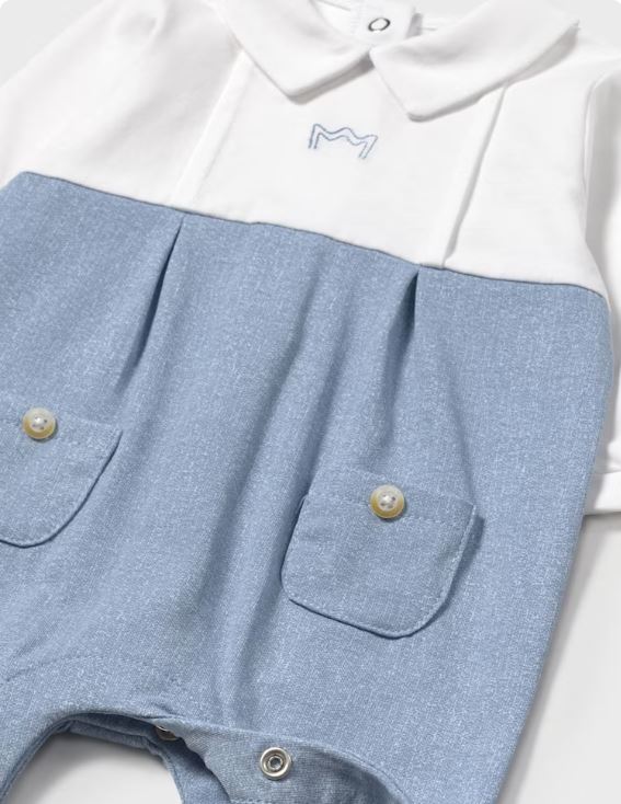 Pijama de manga larga para recién nacido. Diseño con pies. Cuello camisero. Cierre con botones en la espalda para facilitar la puesta de la prenda. Elementos de adorno: bordado.