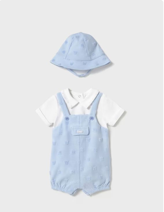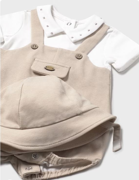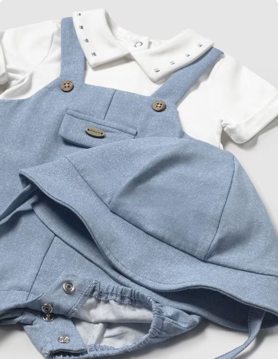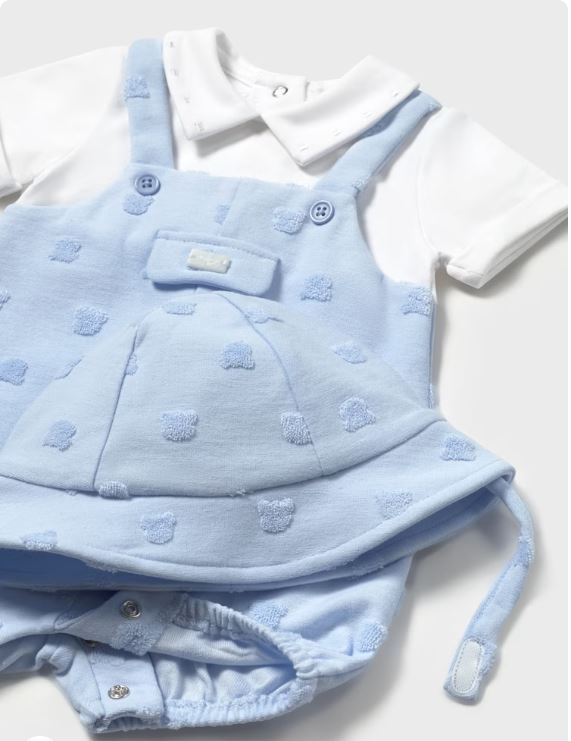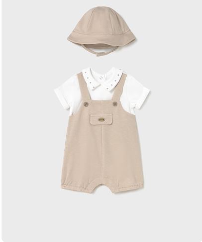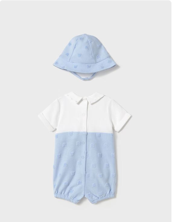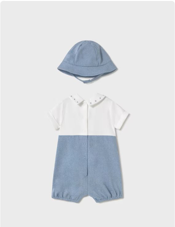 Pelele de manga corta para recién nacido. Cuello camisero. Diseño con peto simulado en superposición. Cierre con botones en la espalda para facilitar la puesta de la prenda. Cierre con botones en la entrepierna.