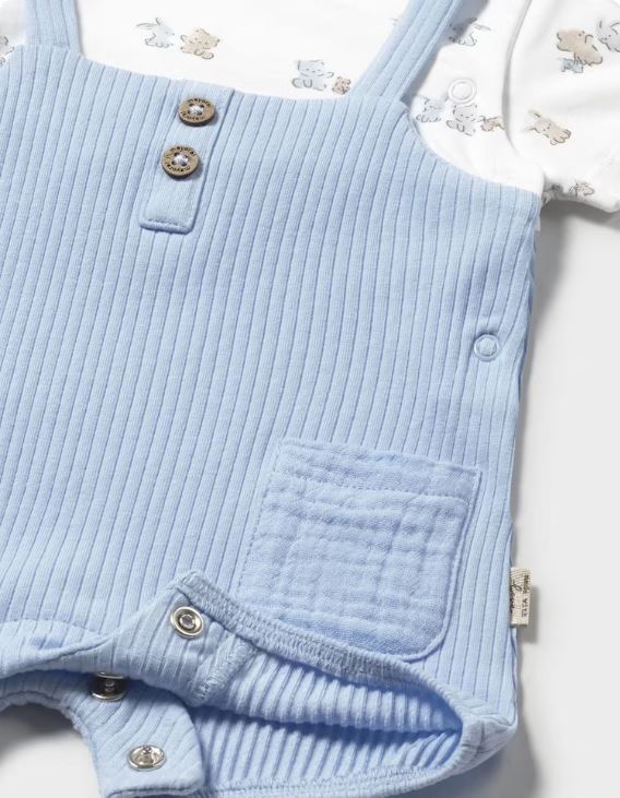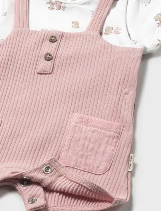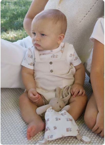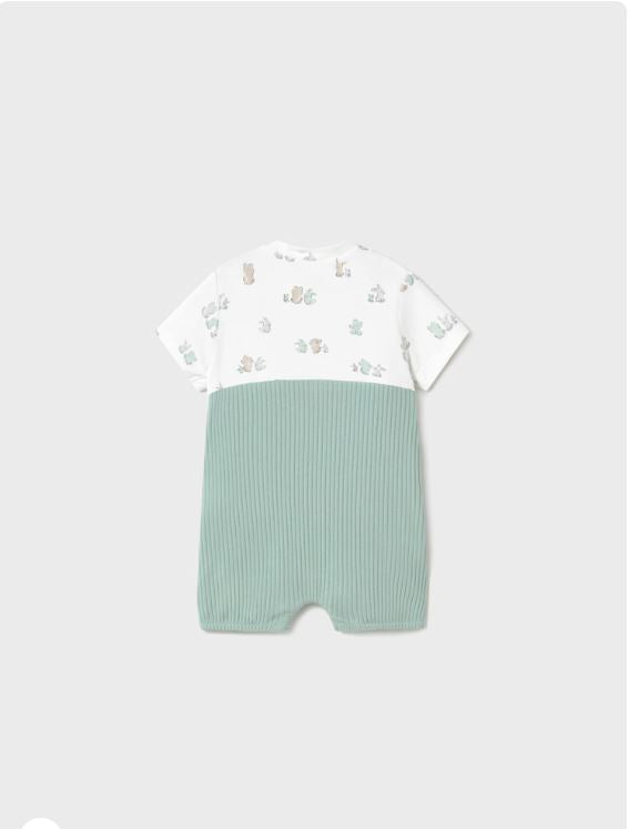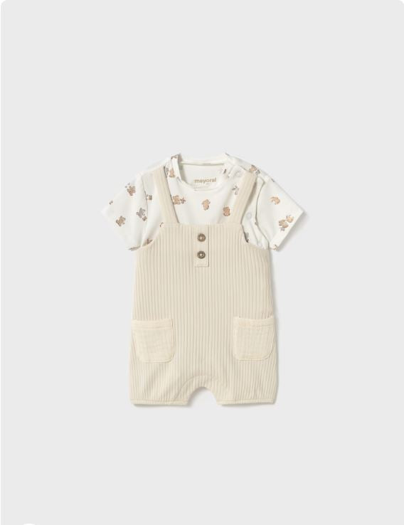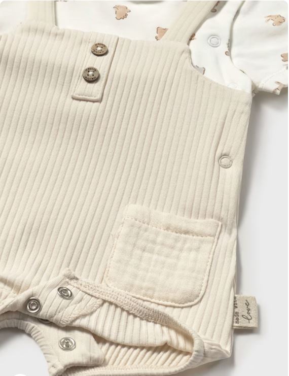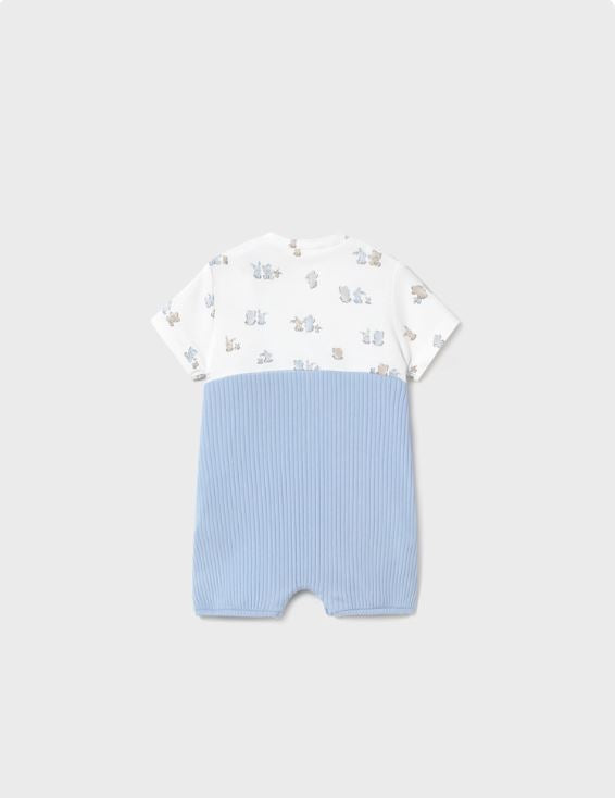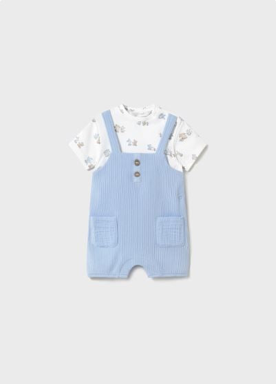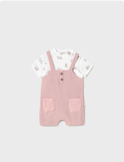 Pelele de manga corta para recién nacido. Diseño con peto simulado en superposición. Cuello cruzado y abertura lateral completa que cierra con botones a presión.