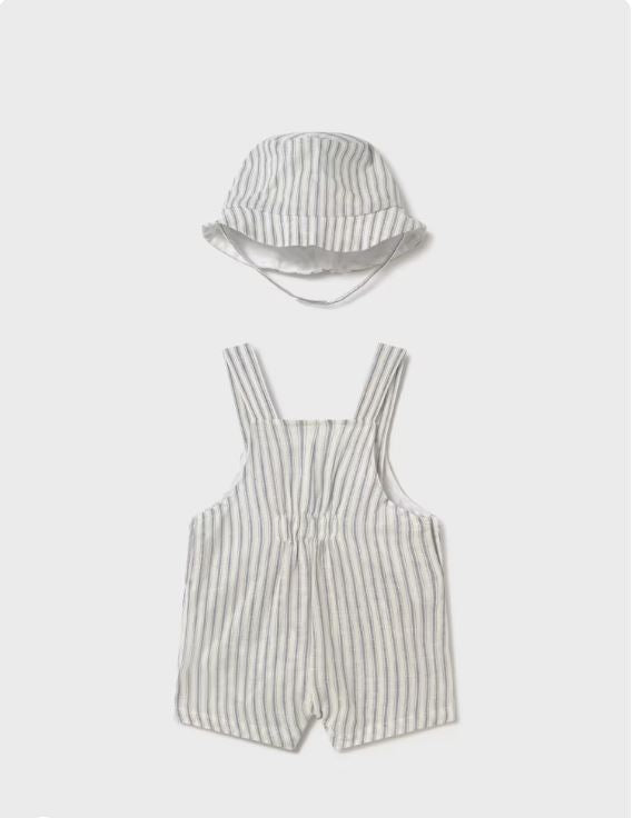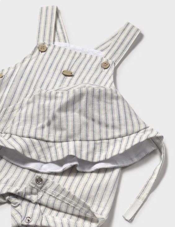 Diseño con tirantes. Abertura con botones en la entrepierna para facilitar el cambio de pañal. Las tallas mayores, de 18 a 36 meses, no llevan dicha abertura. Cierre con botones. Cinturilla elástica. Tejido de aspecto fresco y actual con lino. Diseño estampado.
